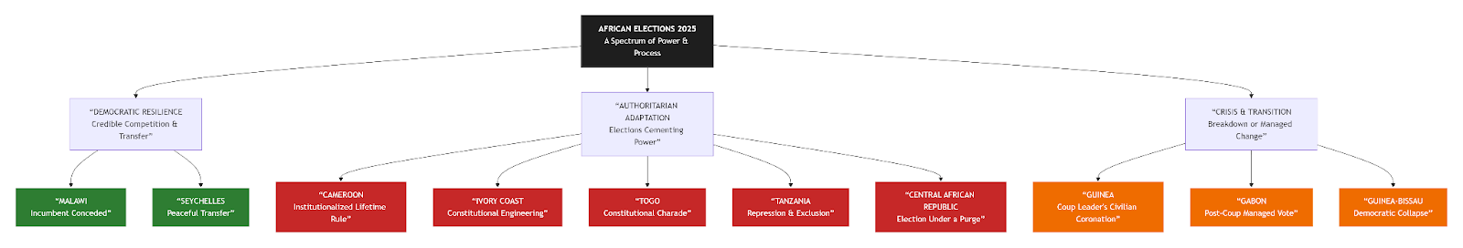 Cameroon represents subtle, institutional manipulation; Ivory Coast and Gabon show constitutional engineering; Tanzania exemplifies repressive overreach; and Togo illustrates the hollowing out of democratic form. Guinea-Bissau marks outright collapse, while Malawi and Seychelles show resilience. This is not random variation but a calculated set of strategies tailored to domestic and international tolerances.